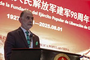 (250730) -- QUITO, 30 julio, 2025 (Xinhua) -- Imagen del 29 de julio 2025 del viceministro de Defensa encargado de Ecuador, Roberto Quintero, hablando en una recepción en conmemoración del 98° aniversario de la fundación del Ejército Popular de Liberación (EPL) de China, en la ciudad de Quito, capital de Ecuador. La Embajada de China en Ecuador celebró el martes una recepción en conmemoración del 98° aniversario de la fundación del EPL de China. (Xinhua/Ricardo Landeta) (rl) (jg) (da) (ce)