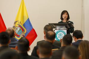 (250902) -- QUITO, 2 septiembre, 2025 (Xinhua) -- Imagen del 1 de septiembre del 2025 de la encargada de Negocios interina de la Embajada de China en Ecuador, Wei Lin, pronunciando un discurso en la ceremonia de inauguración del primer curso de enseñanza del idioma chino mandarín en la sede de la Academia de Lengua China Siyuan, en la ciudad de Quito, capital de Ecuador. Autoridades de las Fuerzas Armadas de Ecuador y de la Embajada de China en Quito inauguraron el lunes el primer curso de enseñanza del idioma chino mandarín dirigido a 60 militares locales, en el marco de un programa de cooperación interinstitucional. (Xinhua/Ricardo Landeta) (rl) (jg) (ra) (vf)
