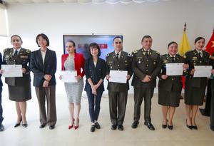 (250610) -- QUITO, 10 junio, 2025 (Xinhua) -- Imagen del 9 de junio del 2025 de la encargada de negocios interina de la embajada china en Ecuador, Wei Lin (4-i), e integrantes de la Policía Nacional de Ecuador posando para una fotografía durante la ceremonia de clausura del programa de capacitación en idioma chino mandarín, en la Academia de Lengua China Siyuan, en la ciudad de Quito, capital de Ecuador. Cuarenta y siete policías de Ecuador completaron el lunes el programa de capacitación en idioma chino mandarín dirigido a oficiales en el marco de un convenio de cooperación interinstitucional iniciado con la Embajada de China en 2023. (Xinhua/Ricardo Landeta) (rl) (oa) (ra) (ce)