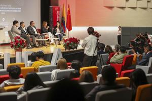 (260408) -- QUITO, 8 abril, 2026 (Xinhua) -- Imagen del 7 de abril de 2026 de Darío Regalado (i-atrás), presidente de la Cámara de Comercio Ecuador-Shanghai-China, Alejandro Romero (3-i-atrás), director de Maquita Cushunchic, e Irina Saltos (2-d-atrás), directora de Proyectos de GUYALMA, asistiendo a la conferencia sobre los resultados de la Exposición Internacional de Importaciones de China (CIIE, por sus siglas en inglés) llevada a cabo en el auditorio de UDLAPark, en Quito, capital de Ecuador. (Xinhua/Ricardo Landeta) (rl) (ah) (ra) (ce)