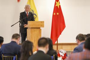 (250429) -- QUITO, 29 abril, 2025 (Xinhua) -- Imagen del 28 de abril de 2025 del embajador de China en Ecuador, Chen Guoyou, pronunciando un discurso durante la ceremonia de conmemoración del primer aniversario de entrada en vigor del Tratado de Libre Comercio (TLC) entre Ecuador y China, organizada por la Cámara de Comercio Ecuador-Shanghai-China, en la ciudad de Quito, capital de Ecuador. Autoridades de Ecuador y China conmemoraron el primer aniversario de la entrada en vigor del TLC entre ambos países, que se cumple el próximo 1 de mayo, destacando los logros alcanzados en el fortalecimiento del intercambio comercial bilateral. (Xinhua/Ricardo Landeta) (rl) (jg) (ra) (vf)