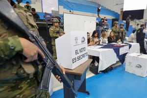 (251109) — QUITO, 9 noviembre, 2025 (Xinhua) — Elementos de las Fuerzas Armadas vigilan durante el Simulacro Nacional de la Consulta Popular y Referendo 2025, organizado por el Consejo Nacional Electoral (CNE) en el auditorio de la Universidad Politécnica Salesiana, en la ciudad Quito, en la capital de Ecuador, el 9 de noviembre de 2025. El CNE de Ecuador realizó el domingo un simulacro a nivel nacional de la consulta popular y el referendo constitucional convocados por el Gobierno para el próximo 16 de noviembre, informó la presidenta del organismo, Diana Atamaint. (Xinhua/Ricardo Landeta) (rl) (rtg) (da)