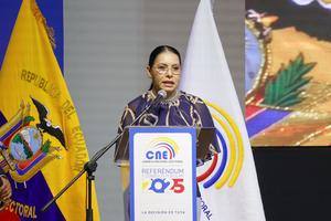 (251109) -- QUITO, 9 noviembre, 2025 (Xinhua) -- La presidenta del Consejo Nacional Electoral (CNE), Diana Atamaint, habla durante el Simulacro Nacional de la Consulta Popular y Referendo 2025, organizado por el CNE en el auditorio de la Universidad Politécnica Salesiana, en la ciudad Quito, en la capital de Ecuador, el 9 de noviembre de 2025. El CNE de Ecuador realizó el domingo un simulacro a nivel nacional de la consulta popular y el referendo constitucional convocados por el Gobierno para el próximo 16 de noviembre, informó la presidenta del organismo, Diana Atamaint. (Xinhua/Ricardo Landeta) (rl) (rtg) (da)