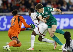 (251024) — QUITO, 24 octubre, 2025 (Xinhua) — Imagen del 23 de octubre del 2025 del guardameta, Alexander Domínguez (i), de Liga Deportiva Universitaria de Quito, de Ecuador, disputando el balón con Agustín Giay (d), de Palmeiras, de Brasil, durante el partido de ida correspondiente a la semifinal de la Copa Conmebol Libertadores, celebrado en el estadio Rodrigo Paz Delgado, en Quito, capital de Ecuador. (Xinhua/Ricardo Landeta) (rl) (rtg) (ra) (ce)