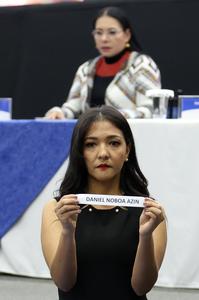 (250317) -- QUITO, 17 marzo, 2025 (Xinhua) -- Imagen cedida por el Consejo Nacional Electoral (CNE) de Ecuador de una modelo mostrando el nombre de uno de los candidatos presidenciales durante el sorteo de ubicación e intervención del debate presidencial entre los candidatos presidenciales Luisa González y Daniel Noboa en la sede de la CNE, en Quito, capital de Ecuador, el 17 de marzo de 2025. El CNE de Ecuador definió el lunes mediante sorteo público el orden de participación de los candidatos presidenciales Luisa González y Daniel Noboa, en el debate obligatorio del próximo 23 de marzo, de cara a la segunda vuelta electoral del 13 de abril. (Xinhua/Hamilton López/CNE) (ah) (rtg) (vf)