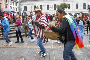 (250501) -- QUITO, 1 mayo, 2025 (Xinhua) -- Personas tocan instrumentos musicales durante una marcha para conmemorar el Día Internacional de los Trabajadores, en la ciudad de Quito, capital de Ecuador, el 1 de mayo de 2025. Cientos de trabajadores, sindicalistas y jubilados de Ecuador se movilizaron el jueves en las principales ciudades del país para conmemorar el Día Internacional de los Trabajadores o Día del Trabajo, exigiendo al Gobierno mejoras laborales en medio de un deterioro de los indicadores de empleo. (Xinhua/Ricardo Landeta) (rl) (rtg) (ra) (ce)