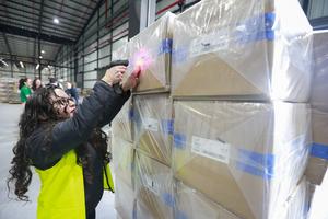 (250208) -- QUITO, 8 febrero, 2025 (Xinhua) -- Una trabajadora inspecciona el código de barras de una caja con urnas y papeletas electorales para su distribución previo a las elecciones presidenciales y legislativas, en la ciudad de Quito, Ecuador, el 8 de febrero de 2025. Más de 13,7 millones de electores, dentro y fuera del país, están convocados a las urnas para elegir presidente y vicepresidente, así como 151 legisladores que integrarán la Asamblea Nacional y cinco representantes al Parlamento Andino. (Xinhua/Ricardo Landeta) (rl) (oa) (rtg) (jg) (ra)