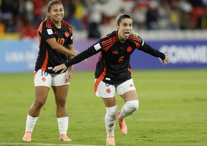 (251029) — QUITO, 29 octubre, 2025 (Xinhua) — Imagen del 28 de octubre de 2025 de la jugadora Daniela Montoya (d), de Colombia, festejando su anotación durante el partido correspondiente a la jornada 2 de la Liga de Naciones Femenina de la Conmebol ante Ecuador, celebrado en el Estadio Rodrigo Paz Delgado, en Quito, capital de Ecuador. (Xinhua/Ricardo Landeta) (rl) (ah) (ra) (ce)