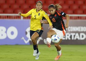 (251029) -- QUITO, 29 octubre, 2025 (Xinhua) -- Imagen del 28 de octubre de 2025 de la jugadora Stefany Cedeño (i), de Ecuador, disputando el balón con Leicy Santos (d), de Colombia, durante el partido correspondiente a la jornada 2 de la Liga de Naciones Femenina de la Conmebol, celebrado en el Estadio Rodrigo Paz Delgado, en Quito, capital de Ecuador. (Xinhua/Ricardo Landeta) (rl) (ah) (ra) (ce)