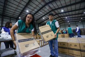 (251103) -- QUITO, 3 noviembre, 2025 (Xinhua) -- Empleados empaquetan cajas con material electoral durante la presentación de los avances logísticos para el próximo proceso electoral, en las instalaciones de la empresa integradora Montgar, en la localidad de Pifo, en el extremo nororiental de Quito, Ecuador, el 3 de noviembre de 2025. El Consejo Nacional Electoral de Ecuador avanza en el proceso de armado y distribución de los paquetes electorales que se utilizarán en la consulta popular y el referendo constitucional convocados por el Gobierno para el próximo 16 de noviembre, informó el lunes la presidenta del organismo, Diana Atamaint. (Xinhua/Ricardo Landeta) (rl) (rtg) (ah) (ce)
