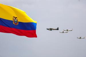 (251027) — QUITO, 27 octubre, 2025 (Xinhua) — Imagen proveída por la Presidencia de Ecuador de aviones de la Fuerza Aérea Ecuatoriana (FAE) sobrevolando durante la ceremonia por los 105 años de creación de la Aviación Nacional y por el día de la FAE, en la Base Aérea Mariscal Sucre, en Quito, Ecuador, el 27 de octubre de 2025. El presidente de Ecuador, Daniel Noboa, aseguró el lunes que la seguridad en el país sudamericano se está recuperando de manera gradual gracias a las operaciones militares emprendidas para enfrentar al crimen organizado, cuya violencia afecta a varias provincias. (Xinhua/Juan Diego Montenegro/Presidencia de Ecuador) (rtg) (ah) (ce)