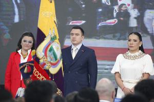 (250515) -- QUITO, 15 mayo, 2025 (Xinhua) -- El presidente ecuatoriano, Daniel Noboa (c), la vicepresidenta ecuatoriana, María José Pinto (i), y la presidenta del Consejo Nacional Electoral (CNE) de Ecuador, Diana Atamaint (d), participan en la ceremonia de entrega de credenciales de presidente y vicepresidenta electos, llevada a cabo en el Centro Cultural Itchimbía, en Quito, capital de Ecuador, el 15 de mayo de 2025. El CNE de Ecuador entregó el jueves las credenciales de presidente y vicepresidenta electos del país a Daniel Noboa y María José Pinto, respectivamente, previo a la ceremonia de toma de posesión del próximo 24 de mayo ante la Asamblea Nacional. (Xinhua/Ricardo Landeta) (rl) (rtg) (ra) (ce)