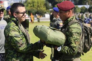 (251216) -- QUITO, 16 diciembre, 2025 (Xinhua) -- El presidente ecuatoriano, Daniel Noboa (i), entrega equipo militar a un miembro del Ejército ecuatoriano durante la ceremonia de entrega de nuevo equipamiento a las Fuerzas Armadas llevada a cabo en el Fuerte Militar Eplicachima, en Quito, capital de Ecuador, el 16 de diciembre de 2025. Noboa entregó el martes nuevo equipamiento a las Fuerzas Armadas para fortalecer su capacidad logística y operativa en la lucha contra el "narcoterrorismo", que afecta al país sudamericano. (Xinhua/Ricardo Landeta) (rl) (jg) (ra) (vf)