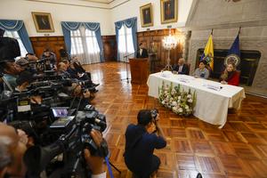 (251020) -- QUITO, 20 octubre, 2025 (Xinhua) -- La canciller ecuatoriana, Gabriela Sommerfeld (2-d-atrás), y el secretario general de la Organización de Estados Americanos (OEA), Albert Ramdin (3-d-atrás), asisten a la firma del Memorando de Entendimiento para la Cooperación Técnica en materia de seguridad multidimensional en Ecuador, en la ciudad de Quito, capital de Ecuador, el 20 de octubre de 2025. Ramdin firmó el lunes un acuerdo de cooperación técnica en seguridad con Ecuador durante su primera visita oficial al país sudamericano, en la que se reunió con el presidente, Daniel Noboa, y autoridades del Gobierno, informó el Ministerio de Relaciones Exteriores y Movilidad Humana. (Xinhua/Ricardo Landeta) (rl) (rtg) (ah) (ce)