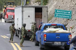 (251013) -- QUITO, 13 octubre, 2025 (Xinhua) -- Militares inspeccionan un camión de carga durante un retén en el marco del paro nacional en una carretera, en Guayllabamba, en la provincia de Pichincha, en la ciudad de Quito, capital de Ecuador, el 13 de octubre de 2025. Ecuador entró el lunes en la cuarta semana del paro nacional indefinido convocado por la Confederación de Nacionalidades Indígenas del Ecuador contra la eliminación del subsidio al diésel, sin que exista un diálogo con el Gobierno para poner fin a las protestas, confirmaron las autoridades locales. (Xinhua/Ricardo Landeta) (rl) (oa) (vf)