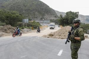 (251013) -- QUITO, 13 octubre, 2025 (Xinhua) -- Motociclistas y vehículos de carga avanzan por un tramo habilitado durante un operativo de control vehicular en el marco del paro nacional en el puente del río Pisque, en Guayllabamba, en la provincia de Pichincha, en la ciudad de Quito, capital de Ecuador, el 13 de octubre de 2025. Ecuador entró el lunes en la cuarta semana del paro nacional indefinido convocado por la Confederación de Nacionalidades Indígenas del Ecuador contra la eliminación del subsidio al diésel, sin que exista un diálogo con el Gobierno para poner fin a las protestas, confirmaron las autoridades locales. (Xinhua/Ricardo Landeta) (rl) (oa) (ah) (vf)