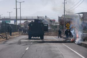 (250916) -- QUITO, 16 septiembre, 2025 (Xinhua) -- Elementos de la policía vigilan durante una protesta por la eliminación del subsidio al diésel, en Quito, capital de Ecuador, el 16 de septiembre de 2025. El presidente de Ecuador, Daniel Noboa, decretó el martes estado de excepción por 60 días en siete provincias del país por "grave conmoción interna", derivada de las protestas y bloqueos de carreteras iniciados la víspera por gremios de transportistas en rechazo a la reciente eliminación del subsidio al diésel. (Xinhua/Ricardo Landeta) (rl) (jg) (ra) (ce)