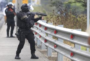(251009) -- SAN MIGUEL DEL COMUN, 9 octubre, 2025 (Xinhua) -- Policías se enfrentan con manifestantes durante un bloqueo en el marco del paro nacional, en la comuna de San Miguel del Común, a las afueras de la ciudad de Quito, capital de Ecuador, el 9 de octubre de 2025. (Xinhua/Ricardo Landeta) (rl) (rtg) (ra) (ce)