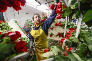 (250504) -- TABACUNDO, 4 mayo, 2025 (Xinhua) -- Imagen del 3 de mayo de 2025 de una trabajadora de la florícola Valent Roses, escogiendo rosas para su exportación, en la ciudad de Tabacundo, en el norte de Ecuador. (Xinhua/Ricardo Landeta) (rl) (rtg) (ah)