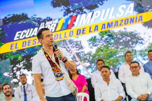 (250917) -- TENA, 17 septiembre, 2025 (Xinhua) -- Imagen proveída por la Presidencia de Ecuador del presidente ecuatoriano, Daniel Noboa (frente), pronunciando un discurso durante el acto de firma de convenios para impulsar el desarrollo de la Amazonía, en la ciudad de Tena, en la provincia de Napo, Ecuador, el 17 de septiembre de 2025. Noboa estimó el miércoles que la economía ecuatoriana crecerá por encima del 4 por ciento en 2025, una proyección más optimista con relación al 3,8 por ciento anunciado esta semana por el Banco Central del país sudamericano. (Xinhua/Juan Diego Montenegro/Presidencia de Ecuador) (ah) (vf)