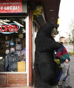 (250814) -- ANCHORAGE, 14 agosto, 2025 (Xinhua) -- Imagen del 14 de agosto de 2025 de un hombre posando para fotografías frente a una tienda, en Anchorage, Alaska, Estados Unidos. El presidente de Estados Unidos, Donald Trump, y el presidente de Rusia, Vladimir Putin, tienen previsto reunirse el viernes en Anchorage. (Xinhua/Wu Xiaoling) (jg) (ah) (ce)