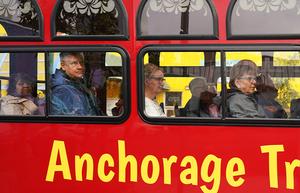 (250814) -- ANCHORAGE, 14 agosto, 2025 (Xinhua) -- Personas toman un autobús turístico, en Anchorage, Alaska, Estados Unidos, el 14 de agosto de 2025. El presidente de Estados Unidos, Donald Trump, y el presidente de Rusia, Vladimir Putin, tienen previsto reunirse el viernes en Anchorage. (Xinhua/Wu Xiaoling) (jg) (ah) (ce)