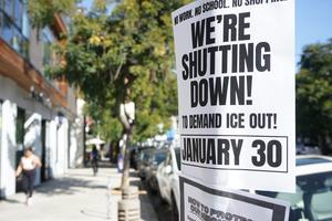 (260131) — SAN FRANCISCO, 31 enero, 2026 (Xinhua) — Imagen del 30 de enero de 2026 de un cartel de protesta uniéndose al «Cierre Nacional», visto en Los Angeles, California, Estados Unidos. Manifestantes se reunieron el viernes en todo Estados Unidos para una huelga general a nivel nacional contra las operaciones federales de control de inmigración y los recientes tiroteos mortales por parte de agentes de inmigración. (Xinhua) (oa) (da)