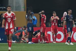 (250706) -- ATLANTA, 6 julio, 2025 (Xinhua) -- Imagen del 5 de julio de 2025 de Jamal Musiala, de FC Bayern Munich, recibiendo ayuda del equipo médico durante el partido de cuartos de final entre Paris Saint-Germain, de Francia, y FC Bayern Munich, de Alemania, en la Copa Mundial de Clubes de la FIFA 2025 en el Estadio Mercedes-Benz, en Atlanta, Georgia, Estados Unidos. (Xinhua/Huang Zongzhi) (rtg) (ah)