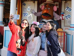 (250515) -- ANAHEIM, 15 mayo, 2025 (Xinhua) -- Imagen del 13 de mayo de 2025 de personas posando para fotografías en el Parque Disney California Adventure, en Anaheim, California, Estados Unidos. Disneyland Resort en California, Estados Unidos, celebra esta semana su 70° aniversario con una gran variedad de eventos especiales, nuevas atracciones, decoraciones vibrantes, comida y bebidas temáticas y artículos conmemorativos. (Xinhua/Qiu Chen) (jg) (ah) (vf)