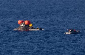 (260411) -- SAN DIEGO, 11 abril, 2026 (Xinhua) -- Imagen del 10 de abril de 2026 de un equipo trabajando en la recuperación de la nave espacial Orión de la Administración Nacional de Aeronáutica y del Espacio de Estados Unidos (NASA) en el océano Pacífico, frente a la costa de California, Estados Unidos. Cuatro astronautas regresaron sanos a la Tierra el viernes tras completar una misión de diez días alrededor de la Luna, informó la NASA. La cápsula Orión amerizó sobre las 17:07 hora local (00:07 GMT del sábado) en el océano Pacífico, a unos 96 kilómetros de la costa de San Diego, California, según la agencia espacial de Estados Unidos. (Xinhua/Joel Kowsky/NASA) (rtg) (da)