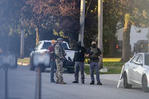 (250926) -- CHICAGO, 26 septiembre, 2025 (Xinhua) -- Oficiales del Servicio de Control de Inmigración y Aduanas (ICE, por sus siglas en inglés) se paran dentro de un área con barricadas en una instalación del ICE, en Broadview, un suburbio en el oeste de Chicago, Estados Unidos, el 26 de septiembre de 2025. (Xinhua/Vincent D. Johnson) (jg) (rtg) (ce)