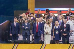 (250615) -- WASHINGTON, 15 junio, 2025 (Xinhua) -- Imagen del 14 de junio de 2025 del presidente estadounidense, Donald Trump (3-i-frente), observando un desfile militar, en Washington D.C., Estados Unidos. Trump organizó el sábado un desfile militar en Washington para conmemorar el 250 aniversario del Ejército con la participación de más de 6.000 soldados, 120 vehículos y un sobrevuelo. El desfile, con un coste reportado de unos 45 millones de dólares estadounidenses, tuvo lugar en medio de las protestas nacionales "No Kings" organizadas para "(rechazar) el autoritarismo, la política multimillonaria y la militarización de nuestra democracia" por parte de la administración Trump. (Xinhua/Hu Yousong) (oa) (da)