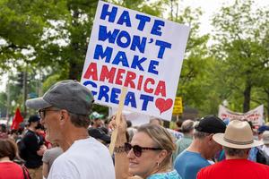 (250502) -- WASHINGTON, D.C., 2 mayo, 2025 (Xinhua) -- Imagen del 1 de mayo de 2025 de personas participando en una manifestación en Freedom Plaza, en Washington, D.C., Estados Unidos. (Xinhua/Hu Yousong) (jg) (da) (ce)