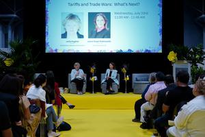 (250724) -- NUEVA YORK, 24 julio, 2025 (Xinhua) -- Imagen del 23 de julio de 2025 de Julia Hughes (i), presidenta de la Asociación de la Industria de la Moda de Estados Unidos, hablando en un panel de discusión de Texworld NYC, la feria comercial de abastecimiento textil más grande de la costa este estadounidense, en Nueva York, Estados Unidos. La actual incertidumbre arancelaria ejerce presión sobre las empresas textiles y de confección estadounidenses, ya que los ejecutivos de abastecimiento advierten que la falta de normas comerciales claras está complicando la planificación de la cadena de suministro, las estrategias de precios y los esfuerzos de diversificación. (Xinhua/Ada Zhang) (rtg) (ra) (ce)