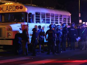 (250611) -- LOS ÁNGELES, 11 junio, 2025 (Xinhua) -- Imagen del 10 de junio de 2025 de personas detenidas por policías por no abandonar el centro de Los Ángeles a tiempo a la entrada en vigor del toque de queda, en el centro de Los Ángeles, California, Estados Unidos. La alcaldesa de Los Ángeles, Karen Bass, anunció el martes por la noche que la ciudad, la segunda más grande de Estados Unidos, ha impuesto un toque de queda en el centro urbano desde las 20:00 a las 06:00 hora local del miércoles (03:00 a 13:00 GMT el miércoles). (Xinhua/Qiu Chen) (ra) (vf)