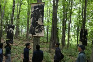 (250630) — LENOX, 30 junio, 2025 (Xinhua) — Imagen del 28 de junio de 2025 del pintor chino, Lan Zhenghui (3-i), presentando su obra durante la exposición al aire libre «Términos Solares: Evento de Arte Contemporáneo con Tinta», en Lenox, Massachusetts, Estados Unidos. En un rincón boscoso de Eastover Estate & Eco-Village, una docena de pergaminos altos, de aproximadamente un metro de ancho y tres de alto, se mecen tranquilamente con la brisa veraniega, visiblemente transformados por la lluvia, la nieve, la luz del sol y el tiempo desde que se instalaron hace un año. (Xinhua/Zhang Fengguo) (oa) (ra) (ce)