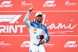 (250504) -- MIAMI, 4 mayo, 2025 (Xinhua) -- Imagen del 3 de mayo de 2025 del piloto británico de la escudería Ferrari, Lewis Hamilton, gesticulando después de la carrera esprint del Gran Premio de Miami de Fórmula Uno en el Autódromo Internacional de Miami, en Miami, Estados Unidos. (Xinhua/ Song Haiyuan) (rtg) (ah)