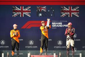 (250505) -- MIAMI, 5 mayo, 2025 (Xinhua) -- Imagen del 4 de mayo de 2025 del piloto australiano de la escudería McLaren, Oscar Piastri (c), festejando con el trofeo en el podio después de la carrera del Gran Premio de Miami de Fórmula Uno, en el Autódromo Internacional de Miami, en Miami, Estados Unidos. (Xinhua/Wu Xiaoling) (rtg) (ah) (vf)
