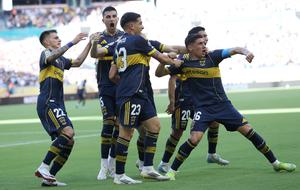 (250617) -- MIAMI, 17 junio, 2025 (Xinhua) -- Imagen del 16 de junio de 2025 de Miguel Merentiel (d-frente), de CA Boca Juniors, festejando su anotación durante el partido del Grupo C entre CA Boca Juniors, de Argentina, y SL Benfica, de Portugal, en la Copa Mundial de Clubes de la FIFA 2025, en el Hard Rock Stadium, en Miami, Estados Unidos. (Xinhua/Li Ming) (oa) (ra) (vf)