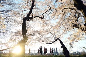 (250414) -- NUEVA YORK, 14 abril, 2025 (Xinhua) -- Imagen del 13 de abril de 2025 de personas caminando junto a flores de cerezo, en Central Park, en Nueva York, Estados Unidos. (Xinhua/Li Rui) (oa) (ah) (ce)