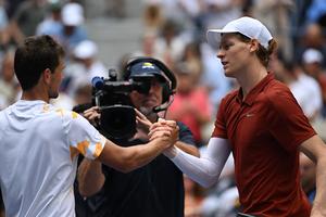 (250827) -- NUEVA YORK, 27 agosto, 2025 (Xinhua) -- Imagen del 26 de agosto de 2025 de Jannik Sinner (d), de Italia, estrechando la mano de Vit Kopriva, de República Checa, al término del partido de la primera ronda de individuales masculinos, en el campeonato de tenis US Open 2025, en Nueva York, Estados Unidos. (Xinhua/Li Rui) (ah) (ra) (ce)