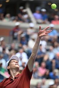 (250827) -- NUEVA YORK, 27 agosto, 2025 (Xinhua) -- Imagen del 26 de agosto de 2025 de Jannik Sinner, de Italia, sirviendo la pelota durante el partido de la primera ronda de individuales masculinos ante Vit Kopriva, de República Checa, en el campeonato de tenis US Open 2025, en Nueva York, Estados Unidos. (Xinhua/Li Rui) (ah) (ra) (ce)