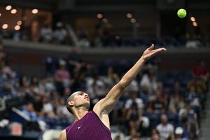 (250826) -- NUEVA YORK, 26 agosto, 2025 (Xinhua) -- Imagen del 25 de agosto de 2025 de Carlos Alcaraz, de España, sirviendo la pelota durante el partido de primera ronda de individuales masculinos, ante Reilly Opelka, de Estados Unidos, en el campeonato de tenis US Open 2025, en Nueva York, Estados Unidos. (Xinhua/Li Rui) (oa) (ah) (vf)