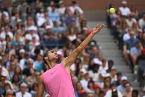 (250901) -- NUEVA YORK, 1 septiembre, 2025 (Xinhua) -- Imagen del 31 de agosto de 2025 de Carlos Alcaraz, de España, sirviendo la pelota durante el partido de la cuarta ronda de individuales masculinos ante Arthur Rinderknech, de Francia, en el campeonato de tenis US Open 2025, en Nueva York, Estados Unidos. (Xinhua/Li Rui) (rtg) (ah) (vf)