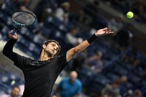 (250904) -- NUEVA YORK, 4 septiembre, 2025 (Xinhua) -- Imagen del 3 de septiembre de 2025 de Lorenzo Musetti sirviendo la pelota durante el partido de cuartos de final de individuales masculinos entre Jannik Sinner, de Italia, y Lorenzo Musetti, de Italia, en el campeonato de tenis US Open 2025, en Nueva York, Estados Unidos. (Xinhua/Li Rui) (rtg) (ra) (vf)
