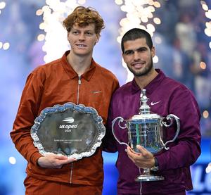 (250908) -- NUEVA YORK, 8 septiembre, 2025 (Xinhua) -- Imagen del 7 de septiembre de 2025 de Carlos Alcaraz (d), de España y Jannik Sinner, de Italia, posando con sus trofeos durante la ceremonia de premiación al término del partido final de individuales masculinos en el campeonato de tenis US Open 2025, en Nueva York, Estados Unidos. (Xinhua/Li Rui) (oa) (ah) (vf)