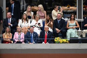 (250908) -- NUEVA YORK, 8 septiembre, 2025 (Xinhua) -- Imagen del 7 de septiembre de 2025 del presidente estadounidense, Donald Trump (d-frente), observando el partido final de individuales masculinos entre Carlos Alcaraz, de España y Jannik Sinner, de Italia, en el campeonato de tenis US Open 2025, en Nueva York, Estados Unidos. (Xinhua/Li Rui) (oa) (ah) (vf)