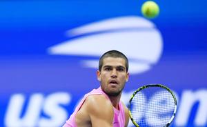 (250908) -- NUEVA YORK, 8 septiembre, 2025 (Xinhua) -- Imagen del 7 de septiembre de 2025 de Carlos Alcaraz, de España, observando la pelota durante el partido final de individuales masculinos entre Carlos Alcaraz, de España y Jannik Sinner, de Italia, en el campeonato de tenis US Open 2025, en Nueva York, Estados Unidos. (Xinhua/Wu Xiaoling) (oa) (ah) (vf)