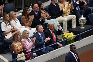 (250908) -- NUEVA YORK, 8 septiembre, 2025 (Xinhua) -- Imagen del 7 de septiembre de 2025 del presidente estadounidense, Donald Trump (c), observando el partido final de individuales masculinos entre Carlos Alcaraz, de España y Jannik Sinner, de Italia, en el campeonato de tenis US Open 2025, en Nueva York, Estados Unidos. (Xinhua/Li Rui) (oa) (ah) (vf)