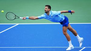 (250906) -- NUEVA YORK, 6 septiembre, 2025 (Xinhua) -- Imagen del 5 de septiembre de 2025 de Novak Djokovic, de Serbia, devolviendo la pelota durante el partido de semifinal de individuales masculinos ante Carlos Alcaraz, de España, en el campeonato de tenis US Open 2025, en Nueva York, Estados Unidos. (Xinhua/Wu Xiaoling) (rtg) (da)